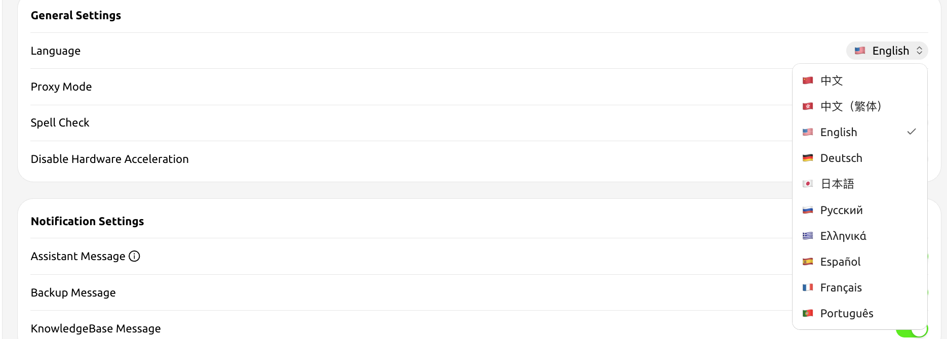 - 💡 使用场景: 如果您习惯阅读英文技术文档或为了截图给国外开发者反馈问题,可在此切换。