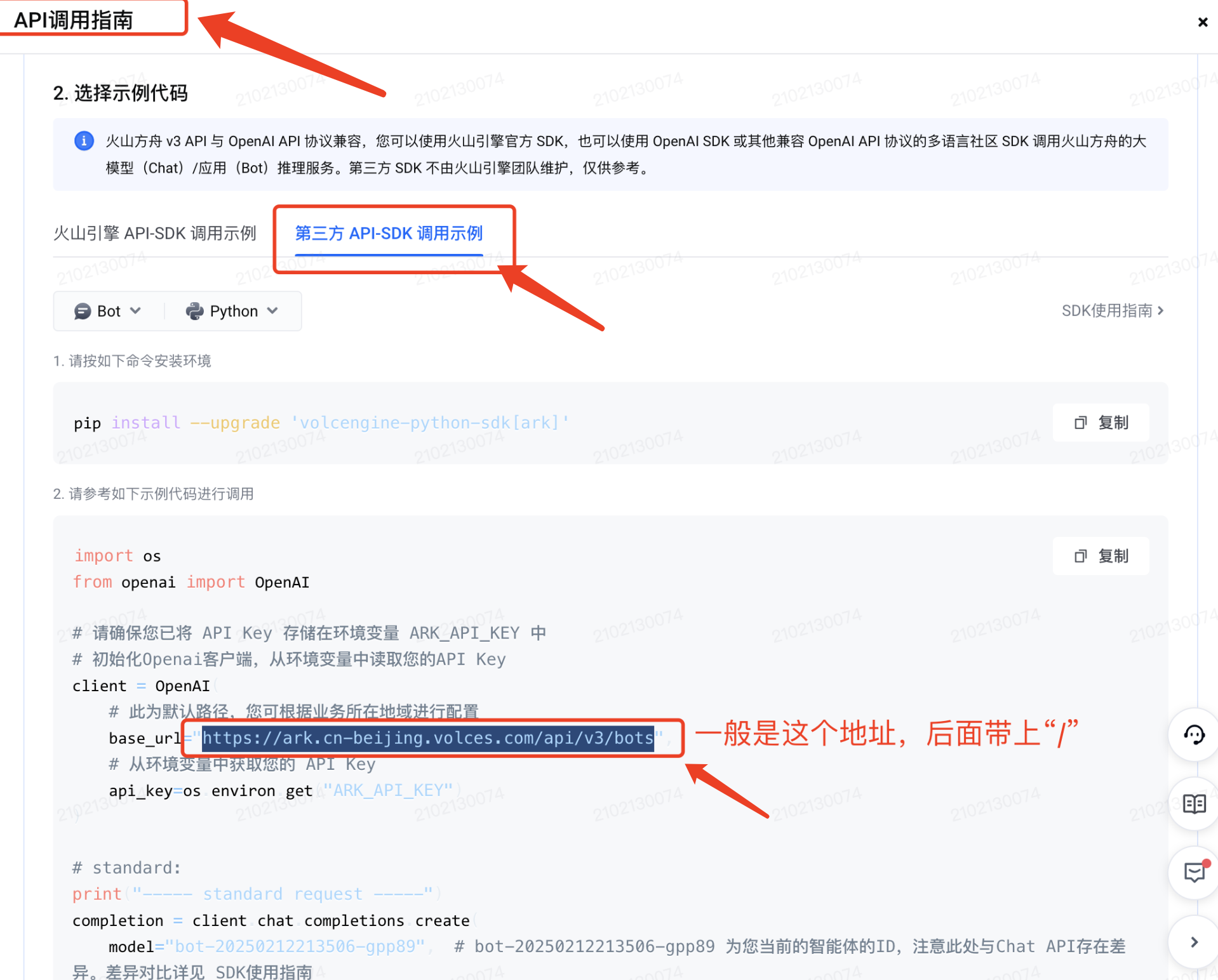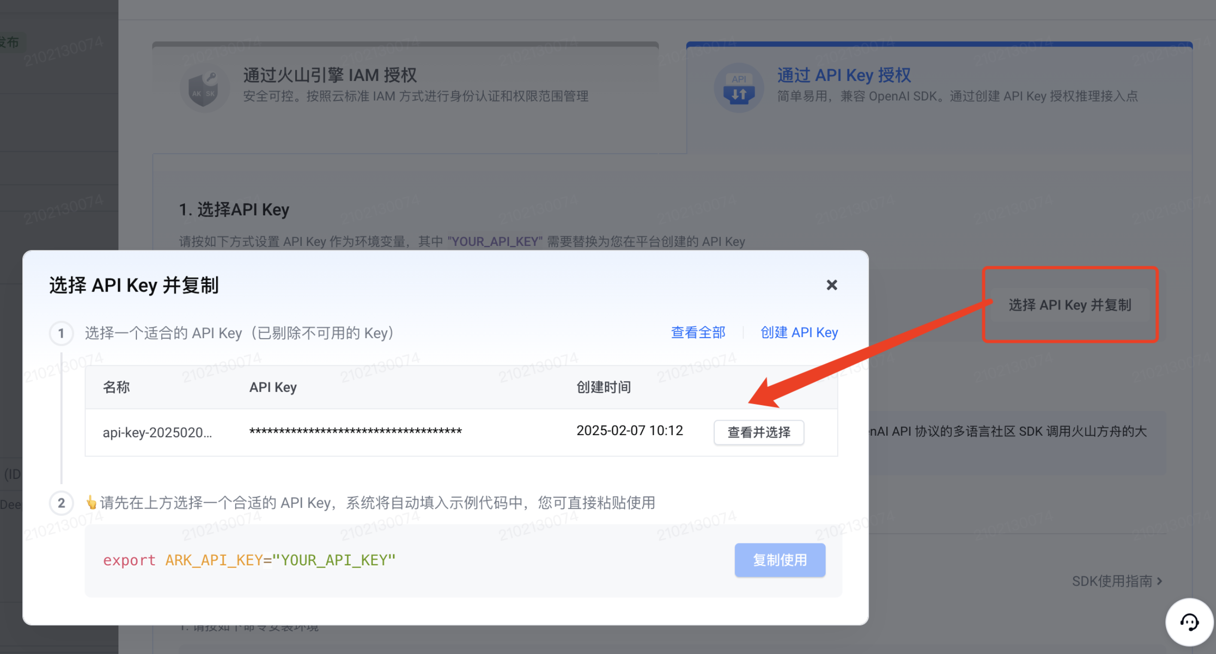 依次点击:「API 调用指南」-「选择 API Key 并复制」-「查看并选择」